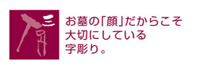 近頃は技術継承の難しさや、 安易な発想のコスト削減から、 コンピュータ彫りによる墓石・ 記念碑が増えてきています。 しかし『佐久間石材』では文字 の持つ強弱を表せる「手彫り」 にこだわりを持って制作をし ております。「顔」である文字 を通して感謝の気持ちや、想 いが伝わるように-。